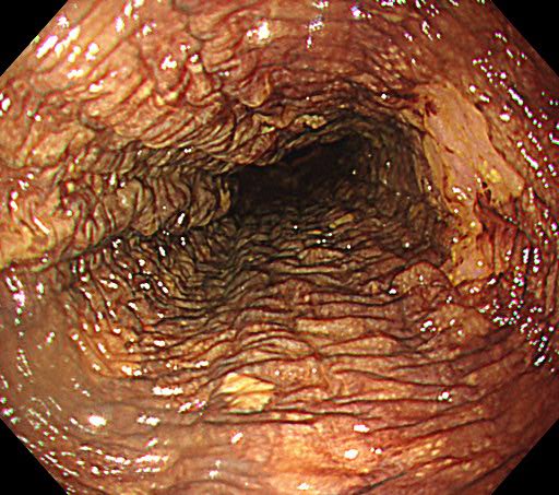 食道をNBIに切り替えて観察していて見つかりました。通常観察では気が付いていませんでした。青緑の視野に中にぽつんと茶色のスポットが浮かび上がっていたのです。さらにルゴールを散布してみると、病変部に一致するルゴール不染帯が浮かび上がりました。この時、偶然に食道の蠕動運動で生じる「畳目ひだ」がほんの数秒間生じました。畳目ひだがいつ生じるかなんて分りません。検査中一度も出ないことの方が多いです。正常粘膜には入っている畳目ひだが病変部には入っていない決定的瞬間を写真に収めることが出来ました(写真参照)。この現象は、がんが粘膜筋板に達していることを意味します。実際、大学病院で内視鏡治療を受けた結果も、がんの深さは粘膜筋板(m3)と診断されました。説得力のある内視鏡写真を紹介状に添えることが出来て良かったです。画面3時方向の白い所が病気です。そこだけたたみ目ひだがありません。